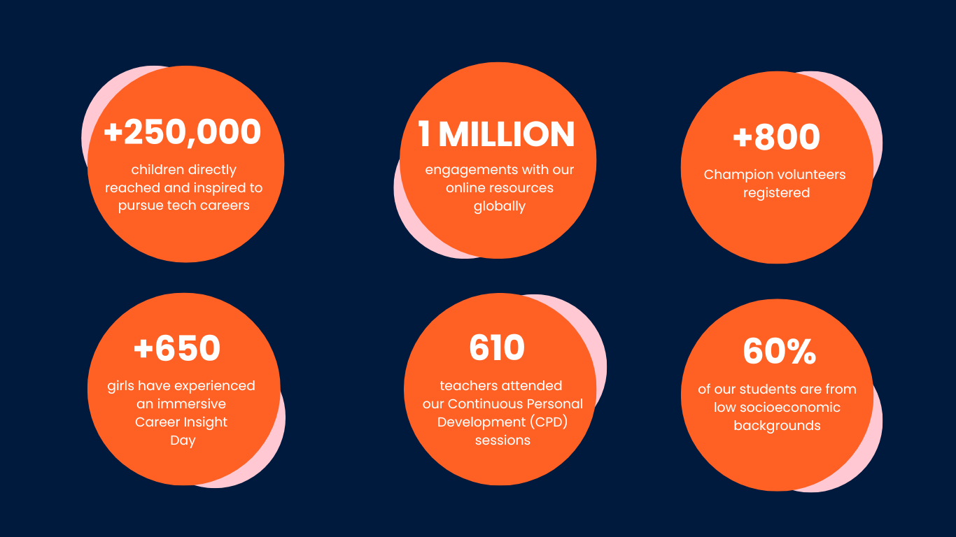 We cannot achieve this level of reach and impact without the funding and support from our partners to provide these fantastic resources and experiences for FREE for schools and young children, particularly those from underrepresented groups and low socioeconomic backgrounds. So a heartfelt thank you from us all at Tech She Can for continuing to support our mission that technology should be for all.